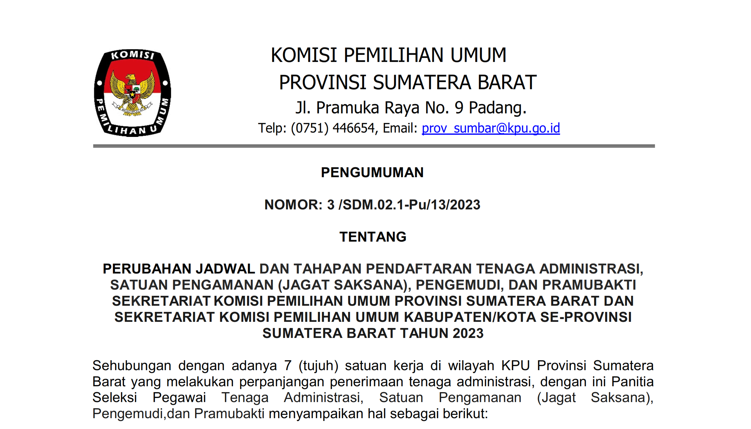 PENGUMUMAN NOMOR: 3 /SDM.02.1-Pu/13/2023 TENTANG PERUBAHAN JADWAL DAN TAHAPAN PENDAFTARAN TENAGA ADMINISTRASI, SATUAN PENGAMANAN (JAGAT SAKSANA), PENGEMUDI, DAN PRAMUBAKTI SEKRETARI AT KOMISI PEMILIHAN UMUM PROVINSI SUMATERA BARAT DAN SEKRETARIAT KOMISI PEMILIHAN UMUM KABUPATEN/KOTA SE-PROVINSI SUMATERA BARAT TAHUN 2023.