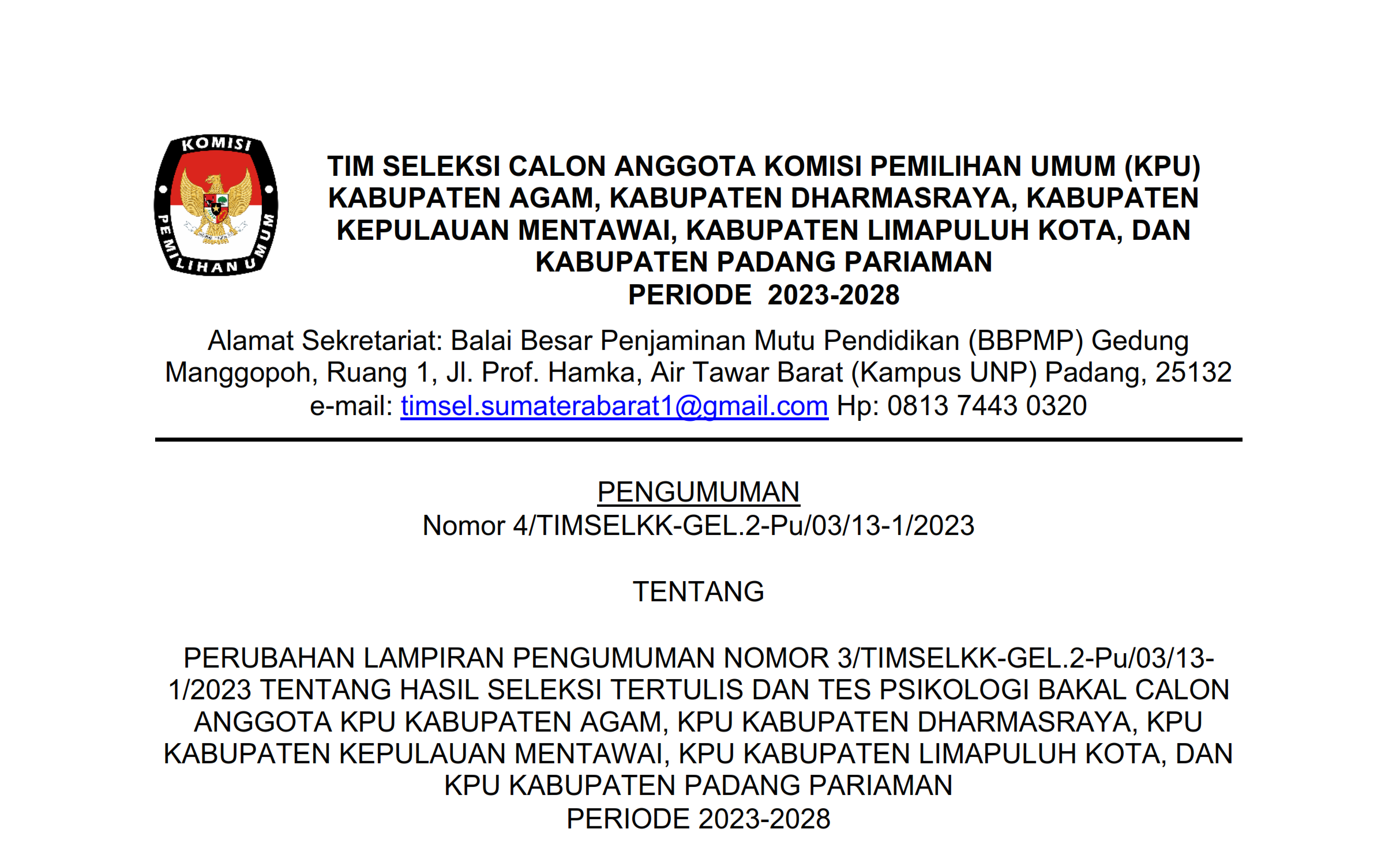 PENGUMUMAN Nomor 4/TIMSELKK-GEL.2-Pu/03/13-1/2023 TENTANG PERUBAHAN LAMPIRAN PENGUMUMAN NOMOR 3/TIMSELKK-GEL.2-Pu/03/131/2023 TENTANG HASIL SELEKSI TERTULIS DAN TES PSIKOLOGI BAKAL CALON ANGGOTA KPU KABUPATEN AGAM, KPU KABUPATEN DHARMASRAYA, KPU KABUPATEN KEPULAUAN MENTAWAI, KPU KABUPATEN LIMAPULUH KOTA, DAN KPU KABUPATEN PADANG PARIAMAN PERIODE 2023-2028
