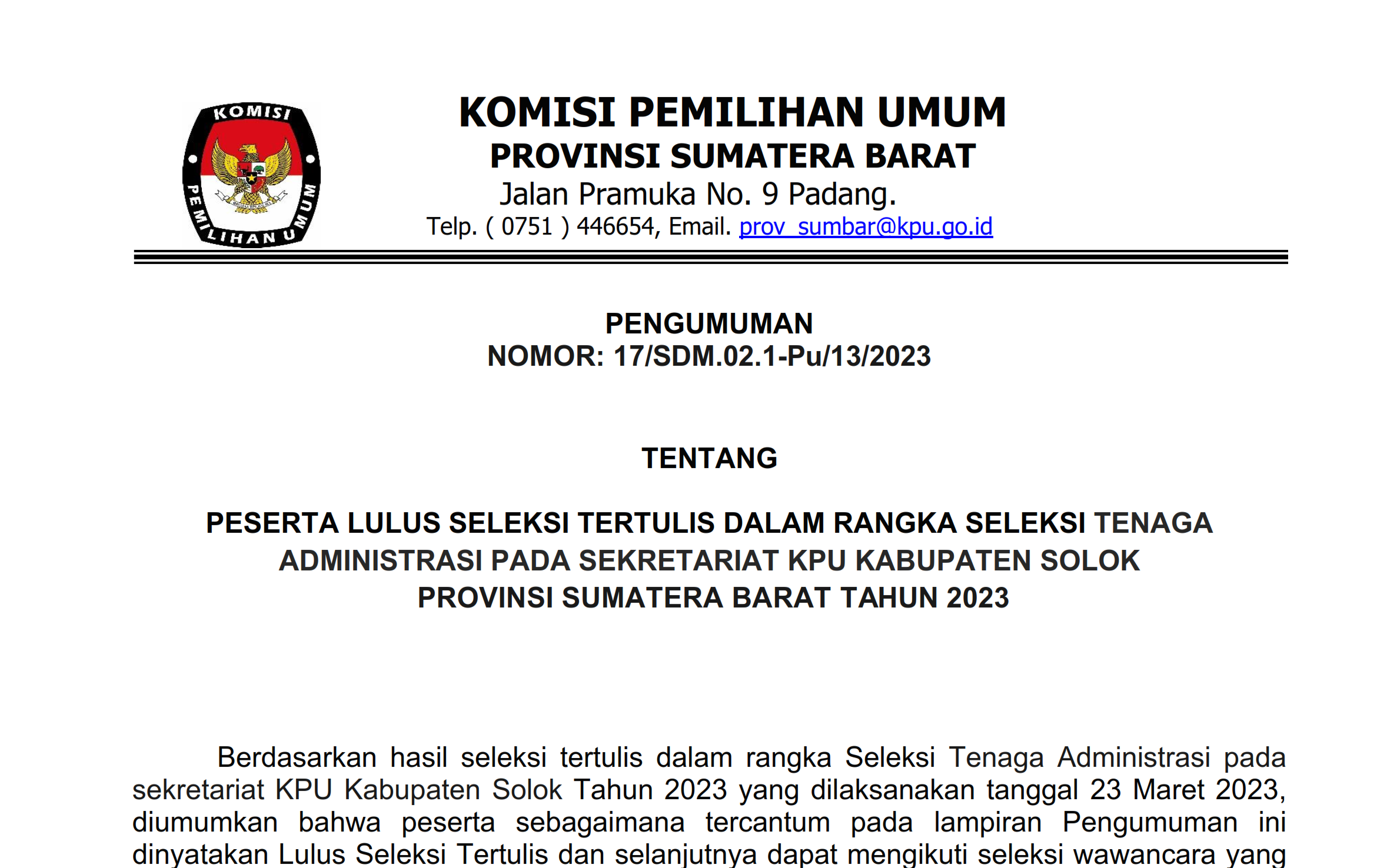 PENGUMUMAN NOMOR: 17/SDM.02.1-Pu/13/2023 TENTANG PESERTA LULUS SELEKSI TERTULIS DALAM RANGKA SELEKSI TENAGA ADMINISTRASI PADA SEKRETARIAT KPU KABUPATEN SOLOK PROVINSI SUMATERA BARAT TAHUN 2023
