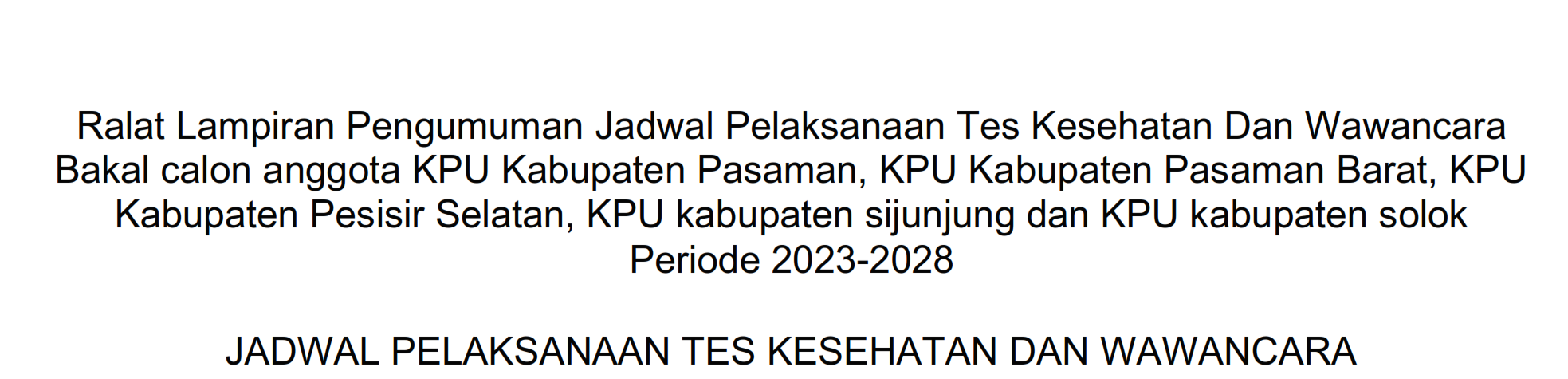 Ralat Lampiran Pengumuman Jadwal Pelaksanaan Tes Kesehatan Dan Wawancara Bakal calon anggota KPU Kabupaten Pasaman, KPU Kabupaten Pasaman Barat, KPU Kabupaten Pesisir Selatan, KPU kabupaten sijunjung dan KPU kabupaten solok Periode 2023-2028