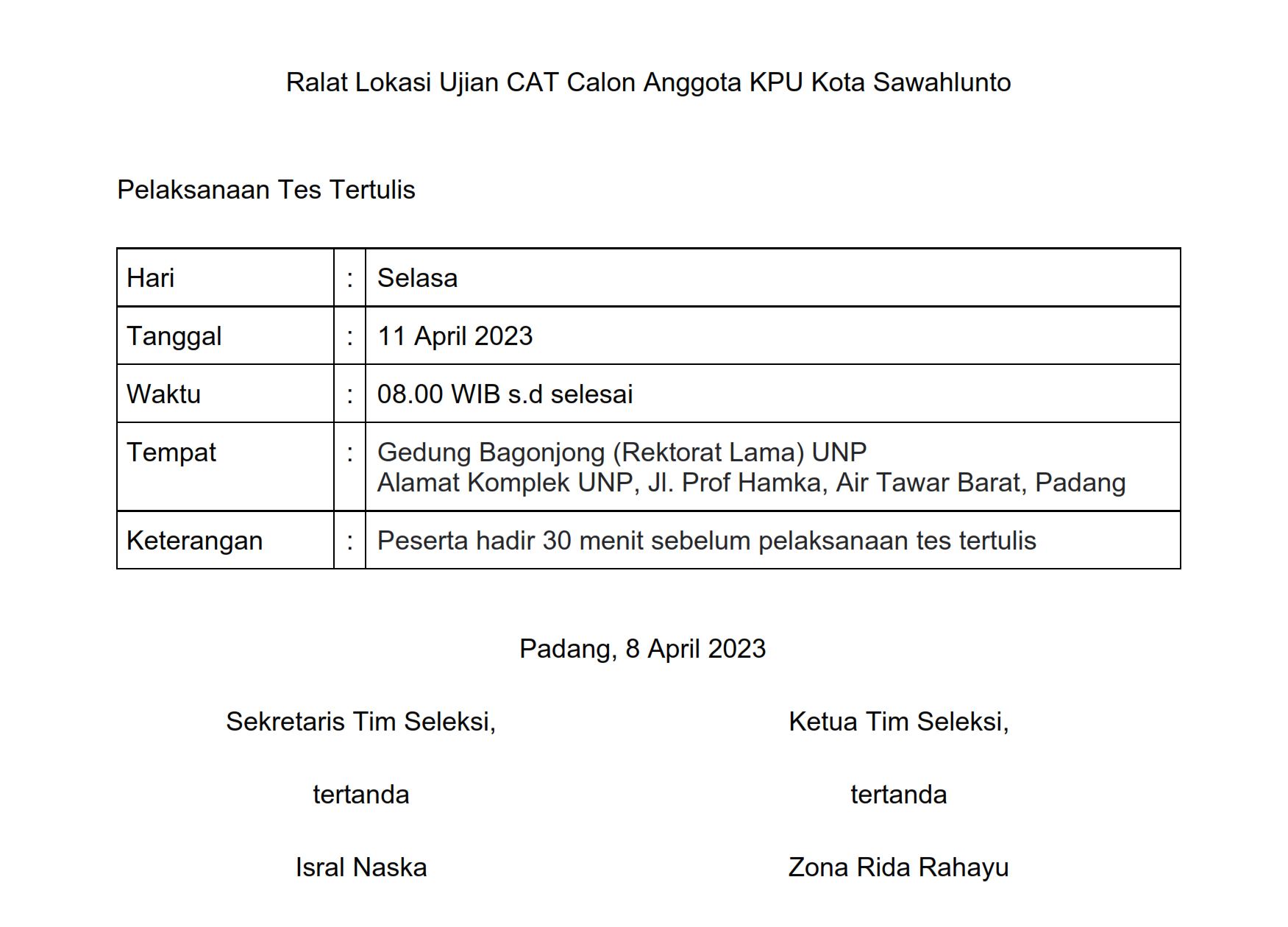 RALAT LOKASI UJIAN CAT CALON ANGGOTA KPU KOTA SAWAHLUNTO