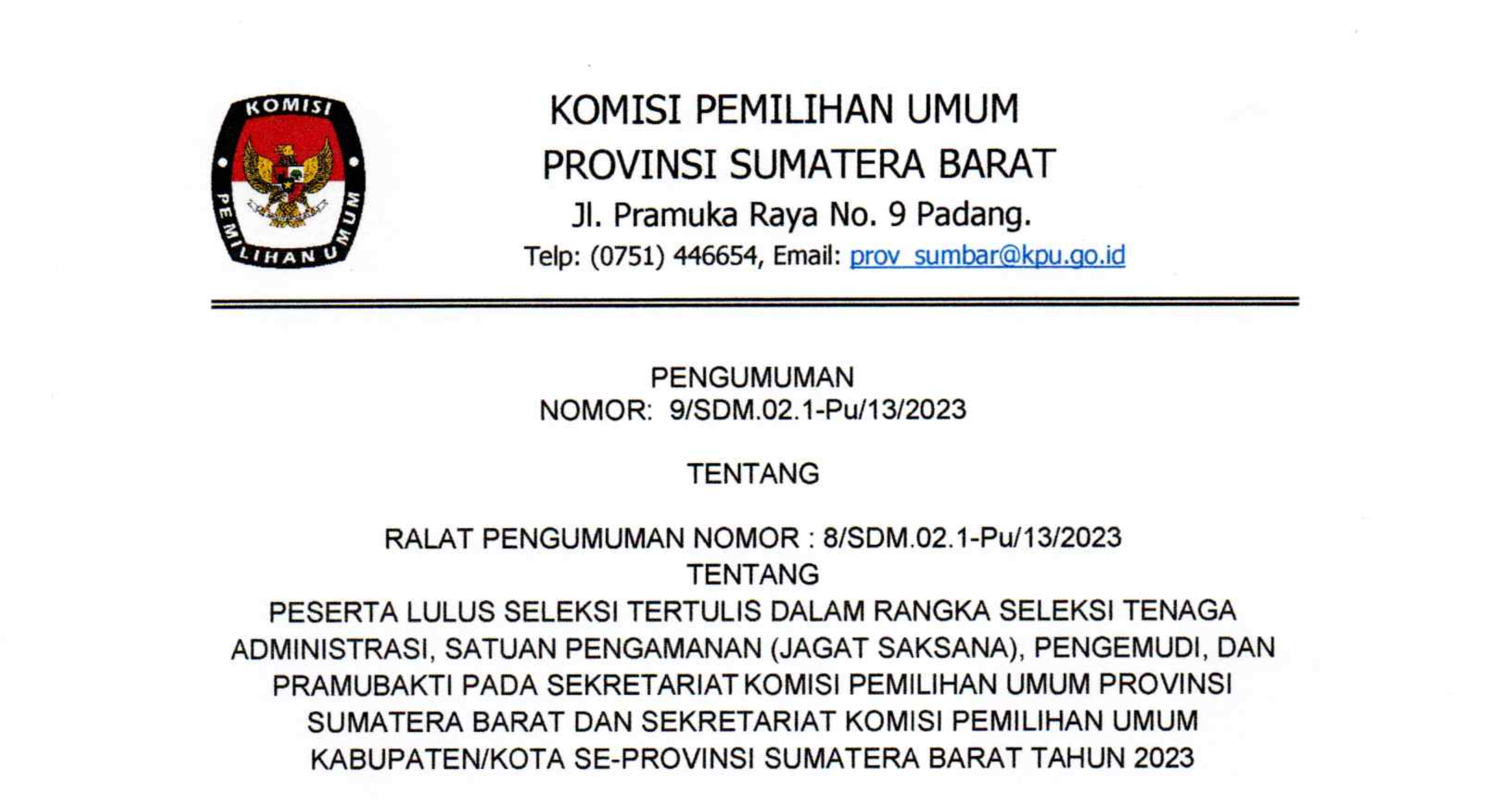 PENGUMUMAN NOMOR: 9/SDM.02.1-Pu/13/2023 TENTANG RALAT PENGUMUMAN NOMOR: 8/SDM.02.1-Pu/13/2023PESERTA LULUS SELEKSI TERTULIS DALAM RANGKA SELEKSI TENAGA ADMINISTRASI, SATUAN PENGAMANAN (JAGAT SAKSANA), PENGEMUDI, DAN PRAMUBAKTI PADA SEKRETARIAT KOMISI PEMILIHAN UMUM PROVINSI SUMATERA BARAT DAN SEKRETARIAT KOMISI PEMILIHAN UMUM KABUPATEN/KOTA SE-PROVINSI SUMATERA BARAT TAHUN 2023