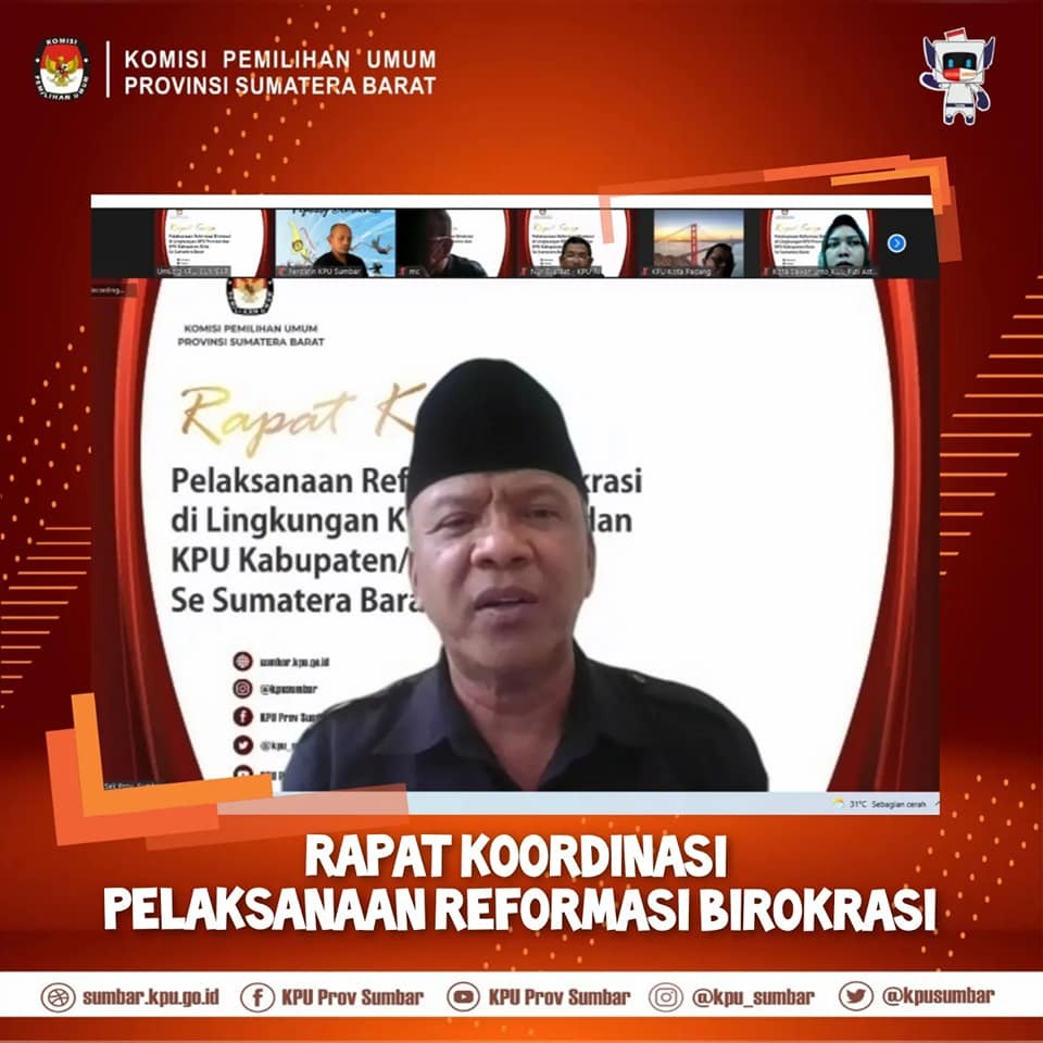KPU Sumbar melaksanakan Rapat Koordinasi Pelaksanaan Reformasi Birokrasi di Lingkungan KPU Provinsi dan KPU Kabupaten Kota se-Sumatera Barat, Rabu, 26 Januari, 2022.