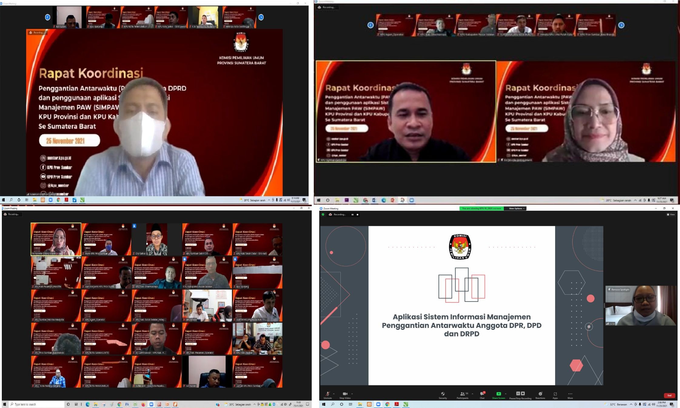 sumbar.kpu.go.id - KPU Sumbar menyelenggarakan Rapat Koordinasi Penggantian Antarwaktu Anggota DPRD Provinsi/Kabupaten/Kota dan penggunaan aplikasi Sistem Informasi Manajemen PAW (SIMPAW) secara daring bersama KPU Kabupaten/Kota se-Sumatera Barat, Kamis (25/11).