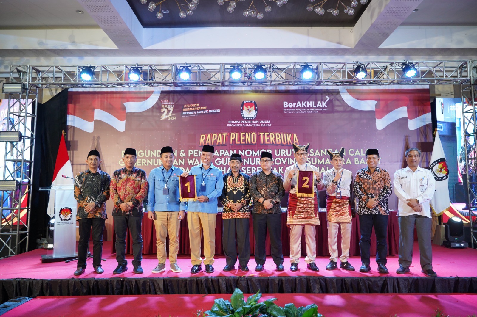 Padang-sumbar.kpu.go.id - Padang, 23 September 2024 – Komisi Pemilihan Umum Provinsi Sumatera Barat menggelar Rapat Pleno Terbuka pengundian nomor urut pasangan calon Gubernur dan Wakil Gubernur Sumatera Barat untuk Pemilihan Serentak Nasional 2024 di Pangeran Beach Hotel, Padang. Acara yang dimulai pukul 14.23 WIB ini dihadiri oleh berbagai pihak, termasuk unsur Forkopimda, Bawaslu, partai politik, ormas, tokoh masyarakat, dan media.