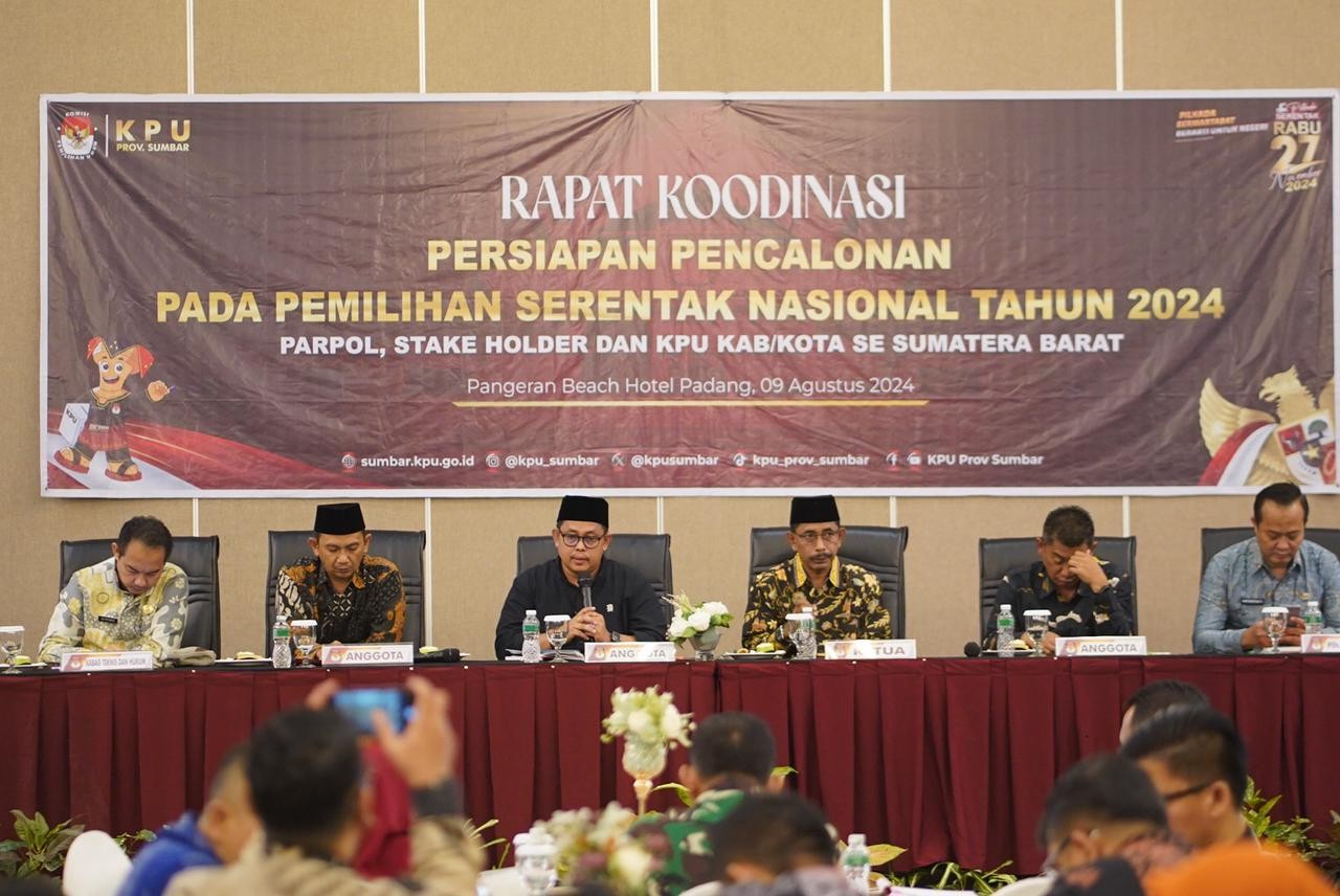 Padang-sumbar.kpu.go.id- Jelang Pendaftaran Pemilihan Gubernur dan Wakil Gubernur, Bupati dan Wakil Bupati serta Wali Kota dan Wakil Walikota Tahun 2024, KPU Provinsi Sumatera Barat mengadakan rapat koordinasi yang melibatkan berbagai pihak terkait. Rapat ini dilaksanakan sebagai upaya memastikan kesiapan tahapan pencalonan untuk Pilkada yang akan digelar serentak pada 27 November 2024.