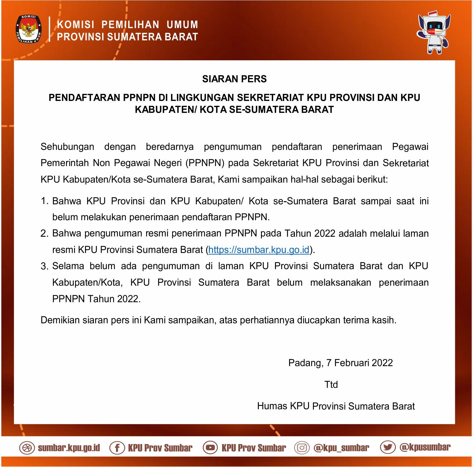 Berikut Siaran Pers KPU Provinsi Sumatera Barat Berkenaan dengan Penerimaan PPNPN Tahun 2022.