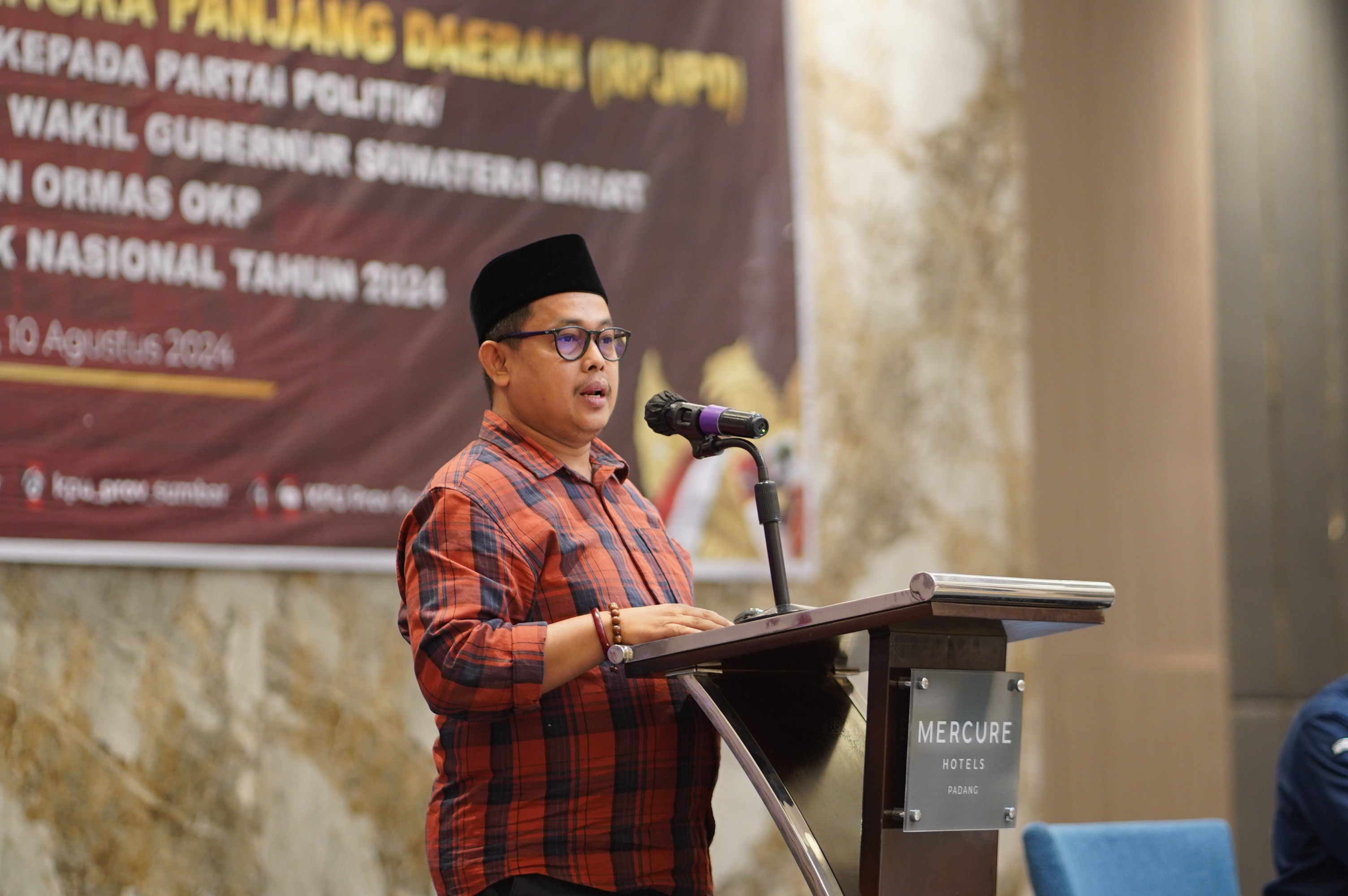 Plh. Ketua KPU Provinsi Sumatera Barat, Ory Sativa Syakban, secara resmi membuka acara dan memberikan arahan terkait dengan penyelenggaraan Pemilihan Serentak 2024. Dalam sambutannya, Ory menekankan pentingnya penyusunan visi, misi, dan program calon kepala daerah yang harus selaras dengan Rencana Pembangunan Jangka Panjang Daerah (RPJPD) untuk memastikan keberlanjutan dan relevansi pembangunan.