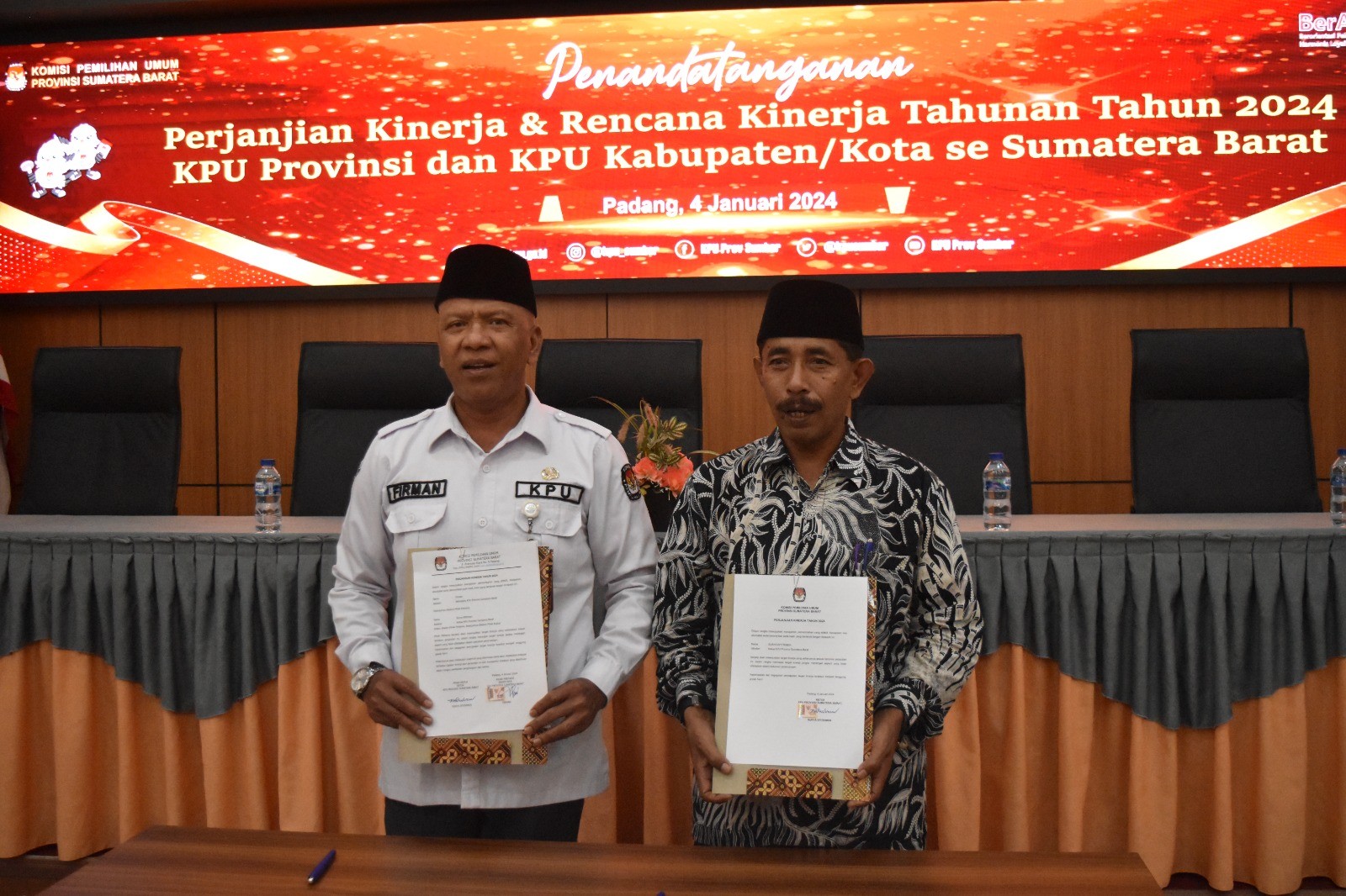 Penandatanganan perjanjian kinerja ini dapat menjadi tolok ukur untuk terhindar dari korupsi, kolusi dan nepotisme (KKN). Saat ini kita sedang dalam tahapan yang tinggal 40 hari untuk melaksanakan pemungutan suara. Penandatanganan ini menunjukkan tekad tinggi kita dalam menjalankan tugas dengan transparansi, efektivitas dan akuntabilitas. Kegiatan ini bukan sekedar seremonial, melainkan langkah konkret kita dalam menciptakan manajemen kinerja yang berkualitas, ucap Medo Patria, Ketua Divisi Perencanaan, Data dan Informasi KPU Provinsi Sumatera Barat dihadapan Ketua dan Sekretaris KPU kabupaten/ kota se- Sumatera Barat dalam kegiatan Penandatanganan Perjanjian Kinerja dan Rencana Kerja Tahunan Tahun 2024 KPU Provinsi dan KPU kabupaten/ kota se- Sumatera Barat (4/1/ 2024) di Aula KPU Provinsi Sumatera Barat.