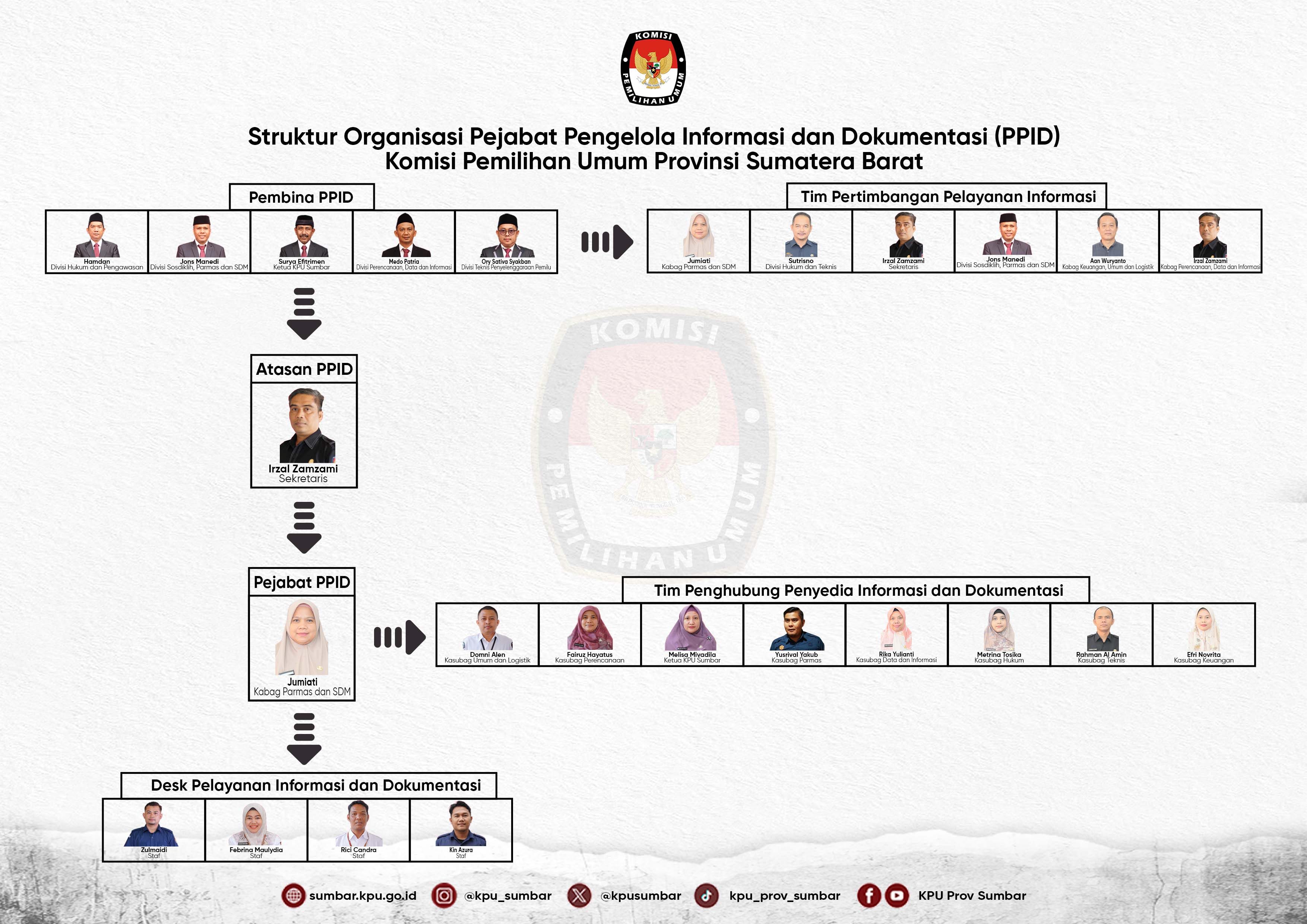 PPID KPU Provinsi Sumatera Barat terbentuk dengan mempedomani Peraturan KPU Nomor 1 Tahun 2015 tentang Pengelolaan dan Pelayanan Informasi Publik di Lingkungan Komisi Pemilihan Umum. Melalui Keputusan Ketua KPU Provinsi Sumatera Barat ditetapkan struktur pejabat Pengelola Informasi dan Dokumentasi (PPID) pada KPU Provinsi Sumatera Barat.dengan susunan sebagai berikut :